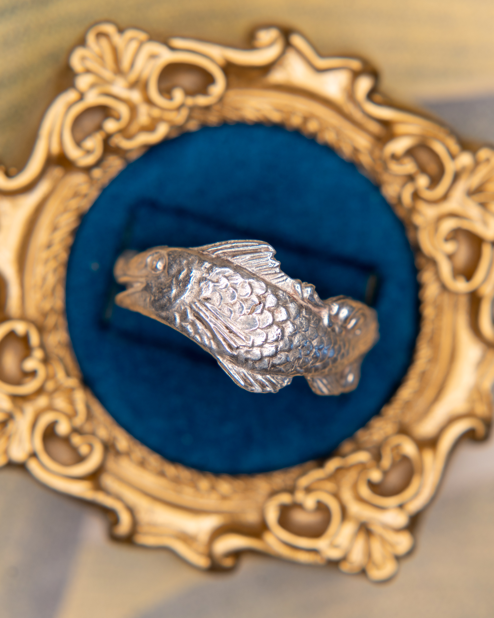 This ring is recast from a sterling silver spoon featuring a beautifully detailed fish design, originally created as a collectible souvenir. The intricate engraving captures the texture, scales, and fluid movement of the fish, reflecting the high level of craftsmanship in early 20th-century silverware.